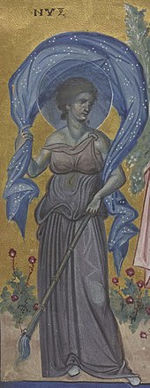 Sie ist eine der direkt aus dem Chaos entstandenen Gottheiten. Sie ist die Mutter einiger Kinder, die sie mit ihrem Bruder Erebos (Finsternis) gezeugt hat, wie beispielsweise Hemera (Göttin des