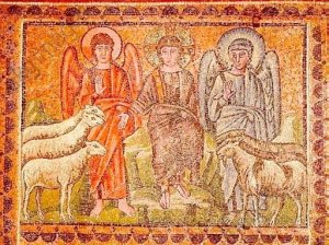 In einer Darstellung aus dem 6. Jahrhundert (in der Kirche San Vitale in Ravenna) begegnet er uns als waschechte Engelsfigur, als Teufel erkennbar an den drei Ziegen und der Farbe blau - damals noch Farbe der Nacht und des Bösen.